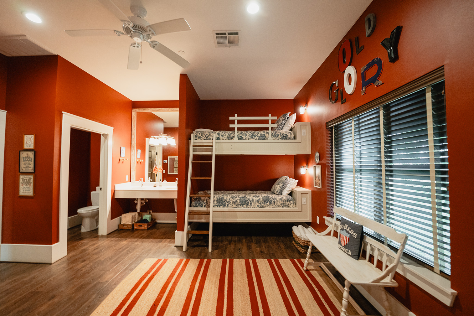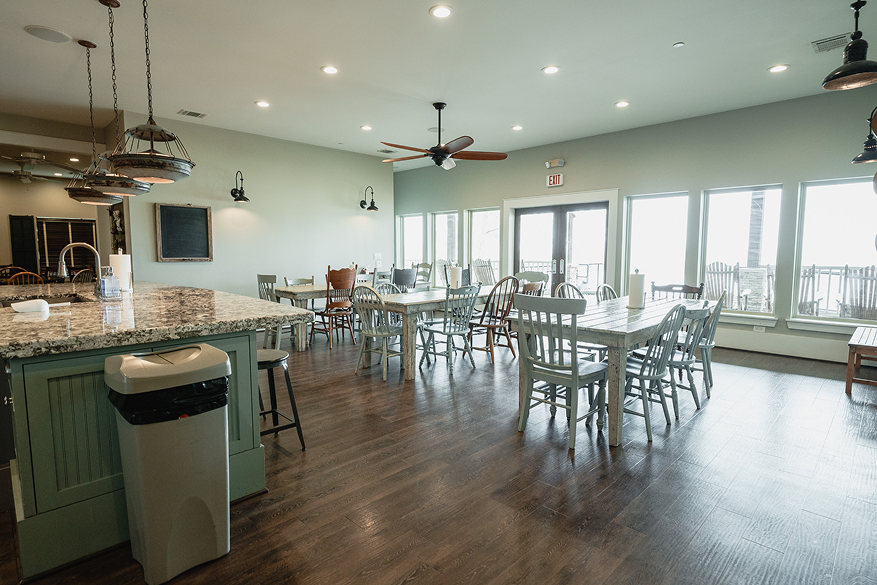 The home at Hunt Retreat features two 71’ porches, 8,800 sq. ft. of air-conditioned living space, 10’ ceilings throughout, 9 bedrooms, 9 1/2 baths (2 of which are ADA compliant), a full kitchen with seating for approximately 30, a central great room with fireplace and cozy seating, and a spacious game room.